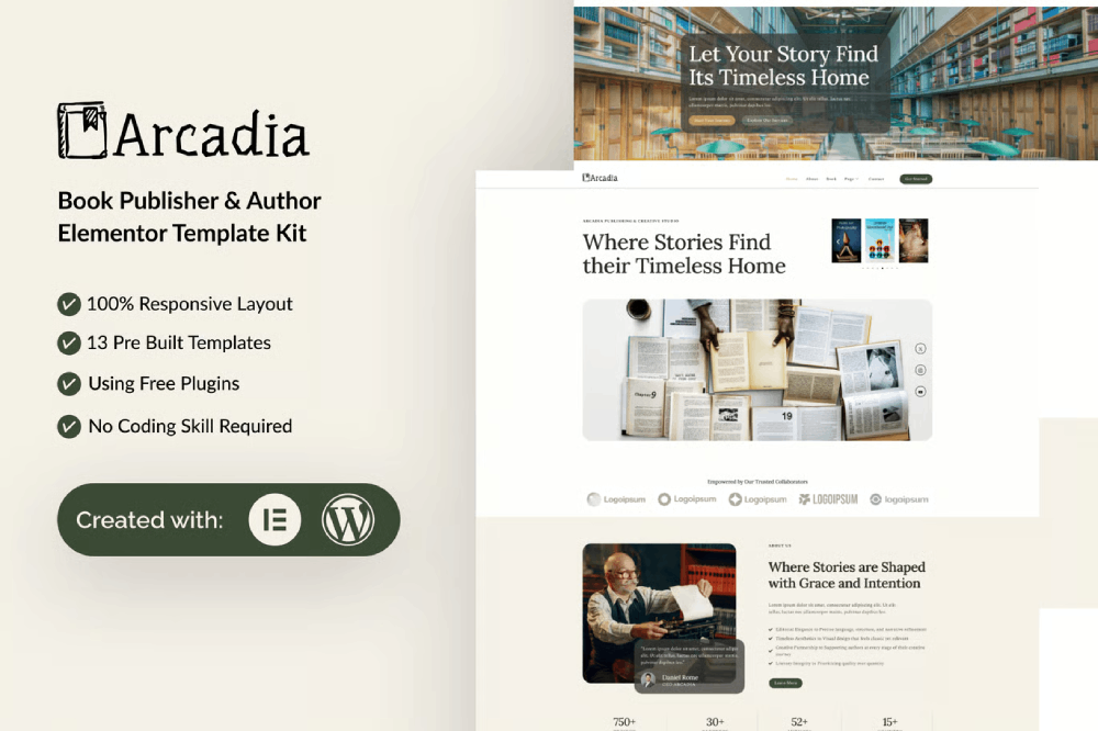 Arcadia is a modern, clean, and professionally designed Elementor Template Kit crafted for book publishers, authors, publishing houses, stationery businesses, bookstores, and magazine websites. Built specifically for WordPress and fully compatible with Elementor, Arcadia allows you to create a polished and engaging website with ease—no coding required. Its elegant design and user-friendly layout help you showcase books, authors, and services in a visually compelling way.