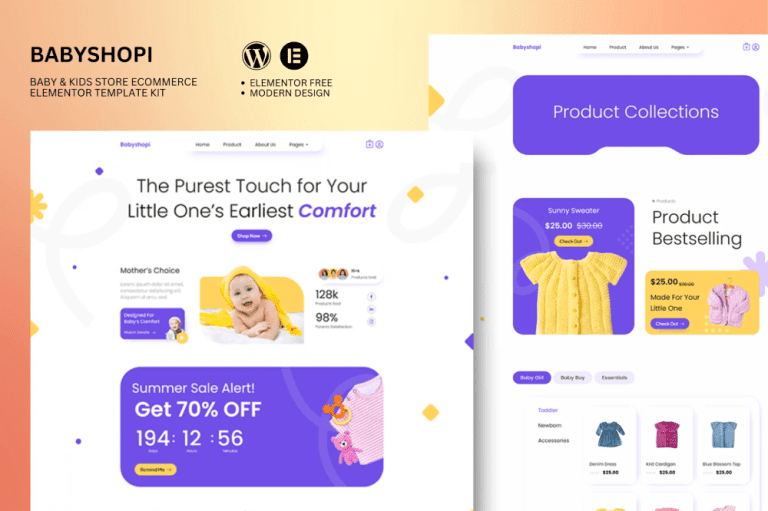 Babyshopi is a clean and modern Elementor Template Kit designed for kids stores, baby shops, and children’s product businesses. Built with the free version of Elementor, it offers stylish layouts that help you create a professional and attractive online store with ease. With simple drag-and-drop customization, you can quickly build your website without any coding knowledge.