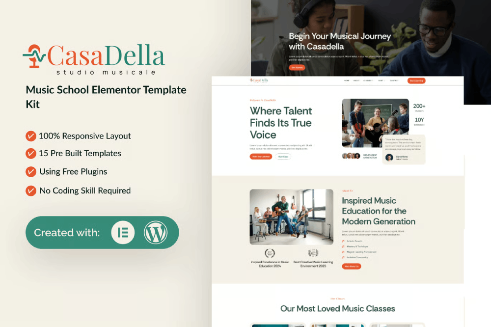 CasaDella – Music School & Academy Elementor Template Kit (Not a WordPress Theme) is a modern, clean, and professionally designed solution for music schools, courses, academies, vocal training, music teachers, and studios. Built for WordPress and fully compatible with Elementor, CasaDella lets you create a stylish and engaging website بسهولة—no coding required.