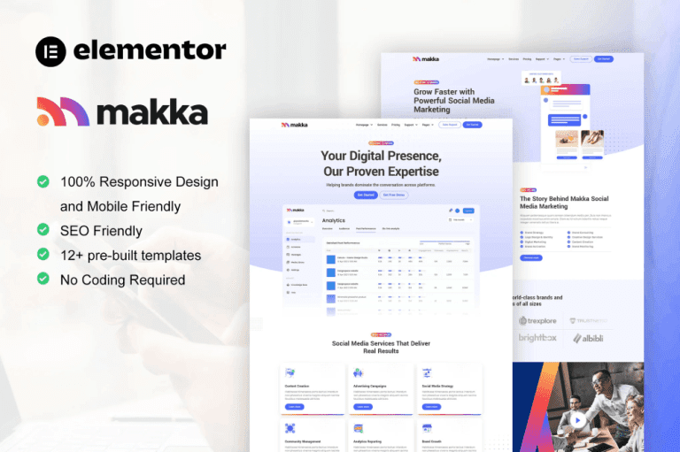 Makka is a modern Elementor Template Kit designed for social media marketing agencies and digital service providers who want to build a powerful online presence with ease. Featuring 12+ professionally crafted templates, it combines creative layouts with a sleek, contemporary design to showcase your services effectively. Whether you run a social media agency, digital marketing firm, or creative business, Makka provides a flexible foundation to launch your website quickly. Built with Elementor, it allows effortless customization through drag-and-drop editing—no coding required. Optimized for the Hello Elementor theme, it ensures fast performance and a fully responsive experience across all devices.