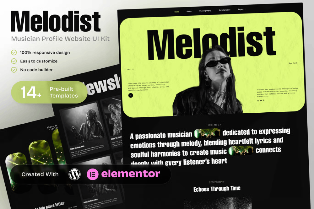 Built with Elementor for seamless drag-and-drop customization, this fully responsive kit ensures a smooth experience across all devices. With a clean layout and performance-focused design, Melodist delivers a consistent, user-friendly platform for growing your music brand.
