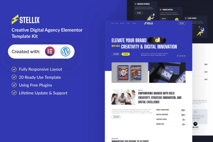 Stellix is a modern Elementor Template designed for creative digital agencies. It features a clean, minimalist design with a stylish layout, making it perfect for showcasing services, portfolios, and brand identity. Built for the Elementor Free version, it allows you to create a professional website without any coding skills.