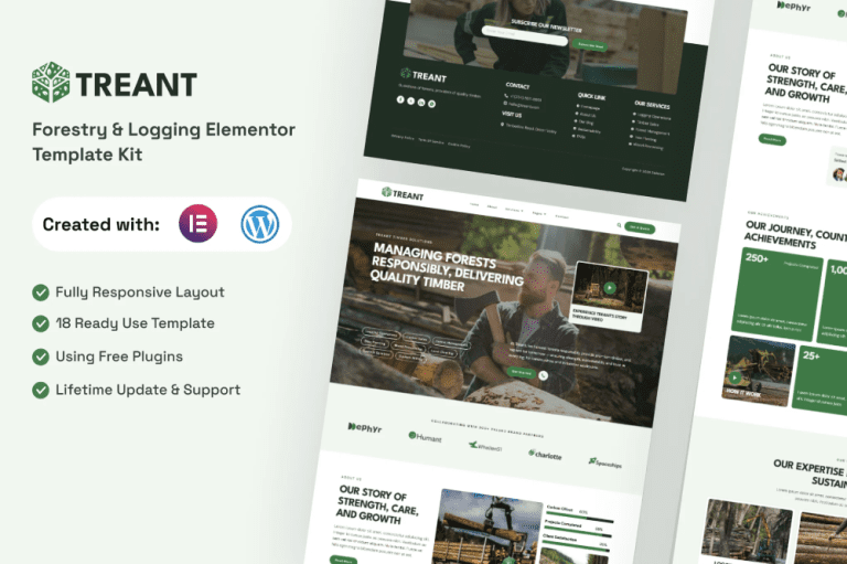 Treant is a clean and modern Elementor Template Kit designed for forestry, logging, lumber, and wood-related businesses. With its minimalist style and professional layout, it helps you create a strong online presence quickly and easily. Built for the Elementor free version, Treant offers simple drag-and-drop customization, making it perfect for users without any coding knowledge.